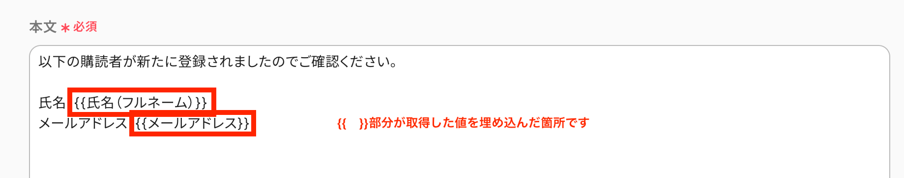 (取得した値を埋め込むことで、Mailchimpで購読者を追加する度に自動的にメールアドレスが反映されるため、入力ミス防止にも繋がります。)