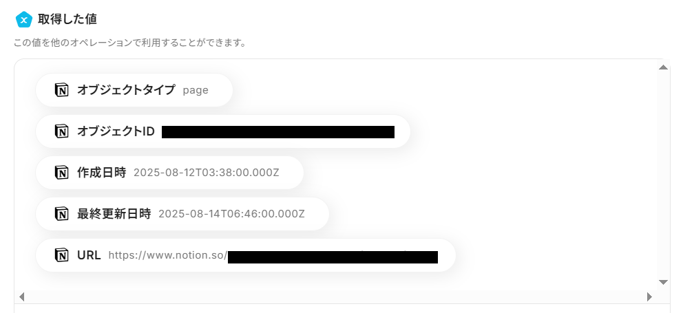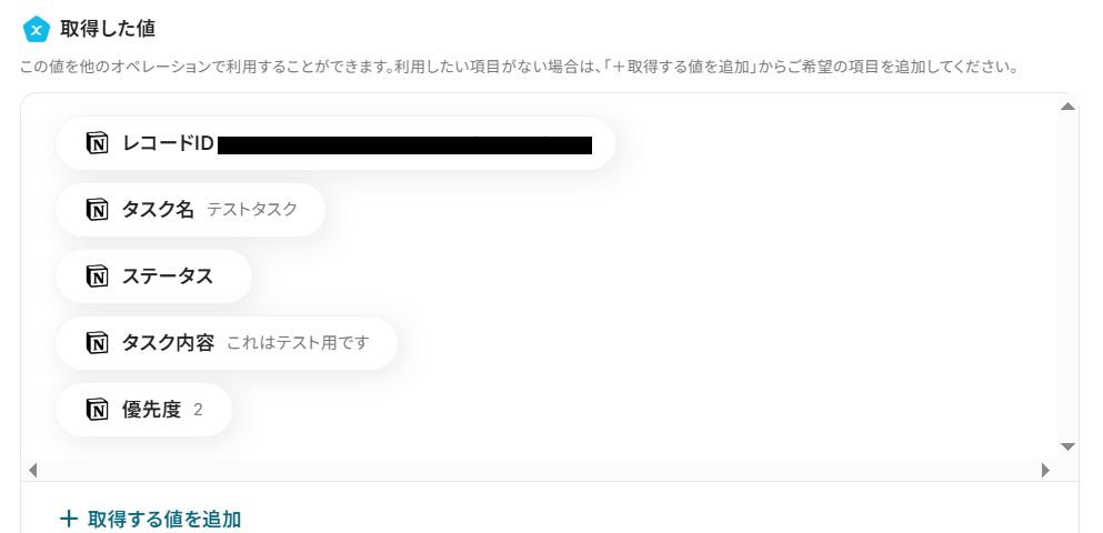 「取得した値」として、Notionの内容が以下のように表示されていれば成功です!