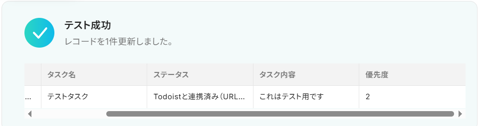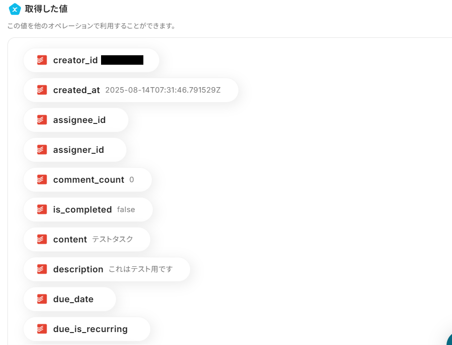 必要な設定が終わったら、「テスト」ボタンを押してみましょう。Todoistに作成されたタスクの内容が、以下のように取得した値として反映されていれば成功です!