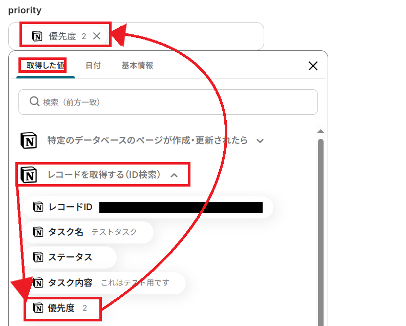例えば優先度を決める「priority」は、前ステップで取得したレコードの内容を反映させられるため、以下のように設定できますね。