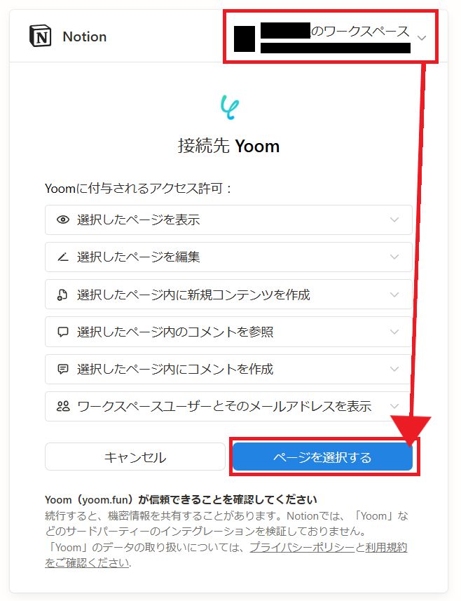 以下の画面が表示されます。右上で任意のワークスペースを設定し、「ページを選択する」をクリックしましょう。