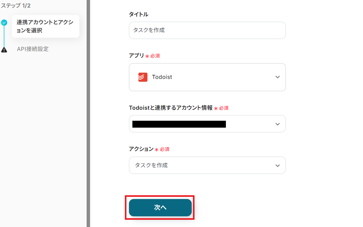 タイトルを任意で設定し、Todoistと連携するアカウントやアクション内容を確認したら「次へ」を押してください。