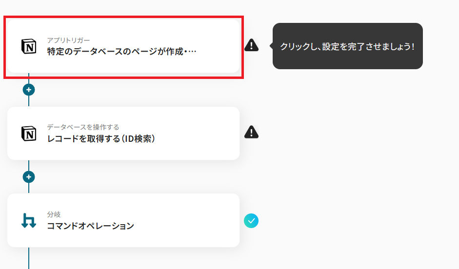 このフローボットでトリガーになっている、Notionで「特定のデータベースのページが作成・更新されたら」というアクションを設定していきましょう。