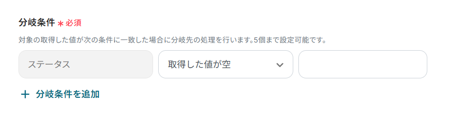 「ステータスの欄に何も入力されていない場合」のみ、Todoistでタスクを作成するアクションに進むという条件を、以下のように設定しました。