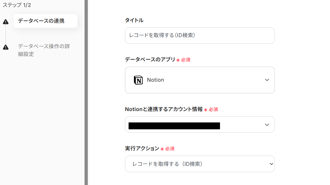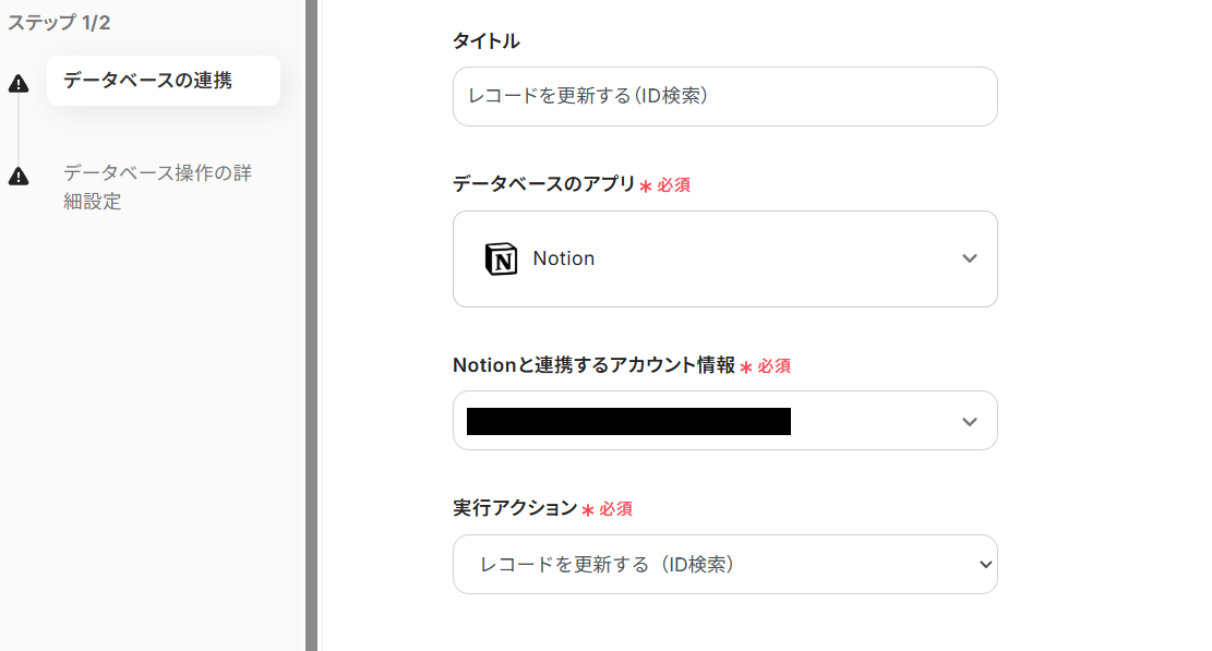 タイトルを任意で設定し、Notionと連携するアカウントやアクション内容を確認します。