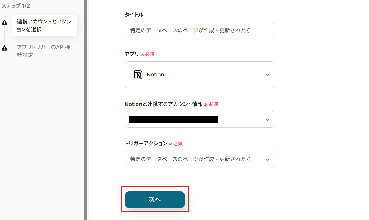 まずはタイトルを任意で設定し、Notionと連携するアカウントやアクション内容を確認したら「次へ」を押してください。