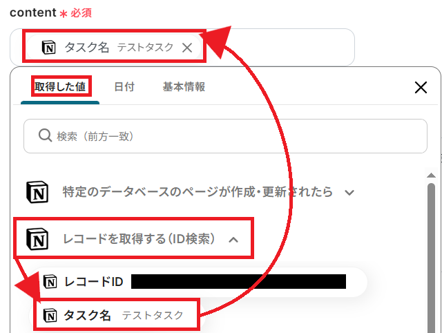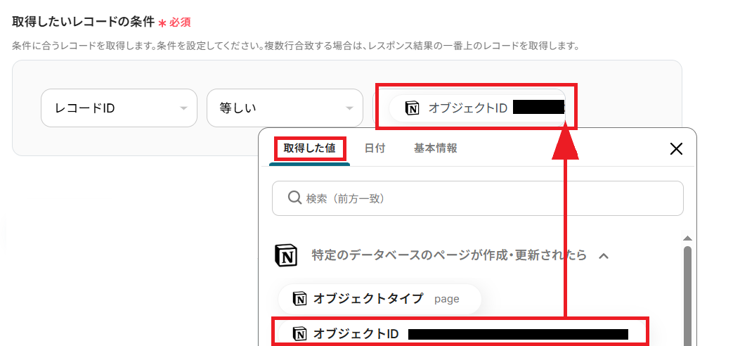 取得したいレコードの条件について設定します。レコードIDを、先ほど更新されたNotionデータベースのオブジェクトIDになるよう、「取得した値」から選択してください。