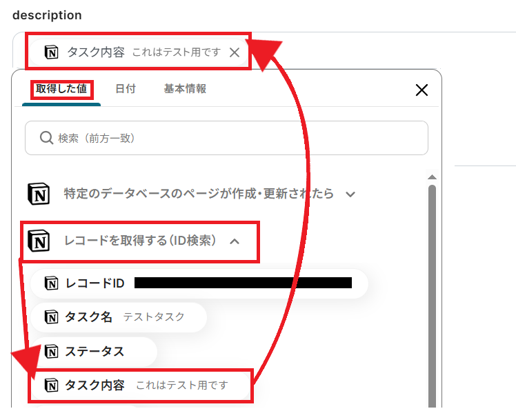 「description」には、タスクの内容を設定しましょう。こちらもNotionのデータベースから取得した値を活用してください。