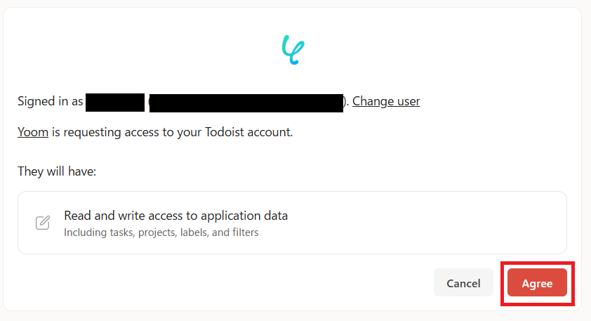 YoomがTodoistにアクセス権限を求めているので、「Agree」をクリックしてください。