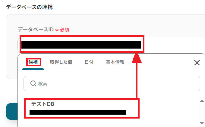 下にスクロールして、データベースのIDを入力します。先ほど連携したデータベースですので、ボックス内をクリックすると「候補」の一覧に該当のデータベースが表示されています。