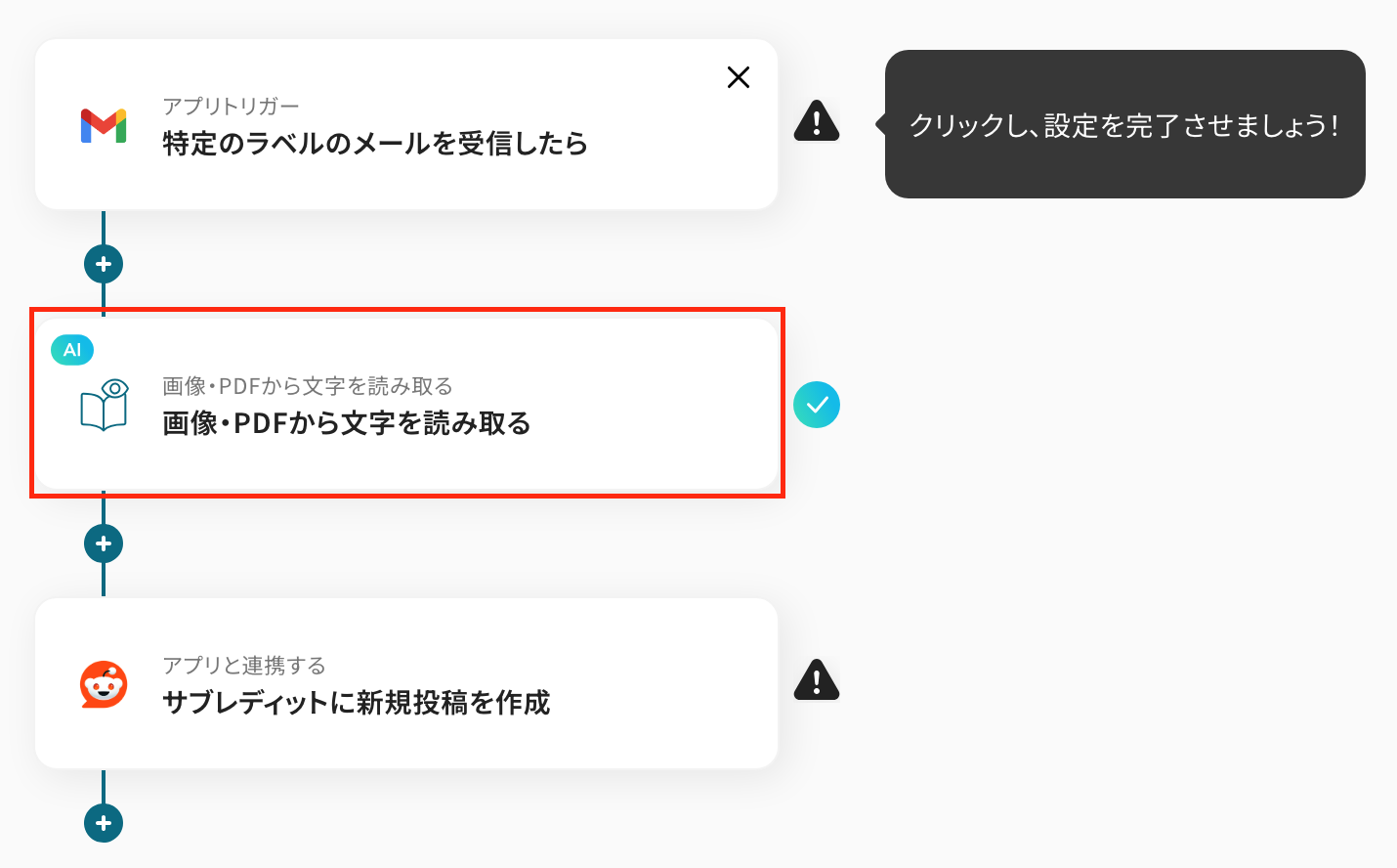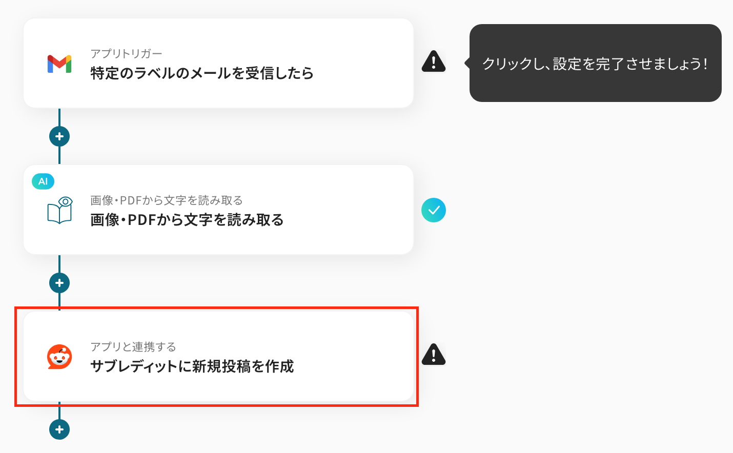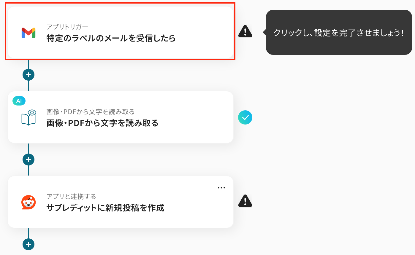 - Gmailのトリガー設定とOCR、Redditのアクション設定