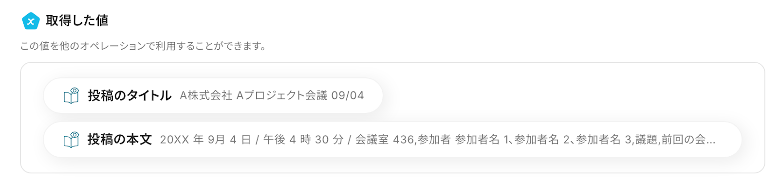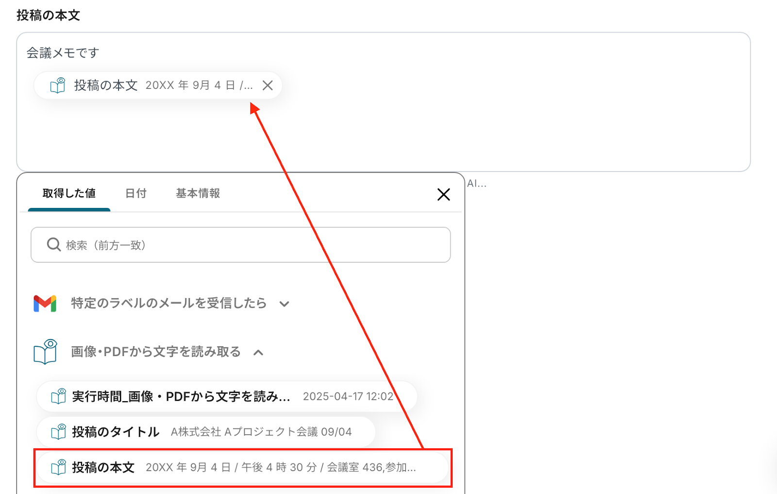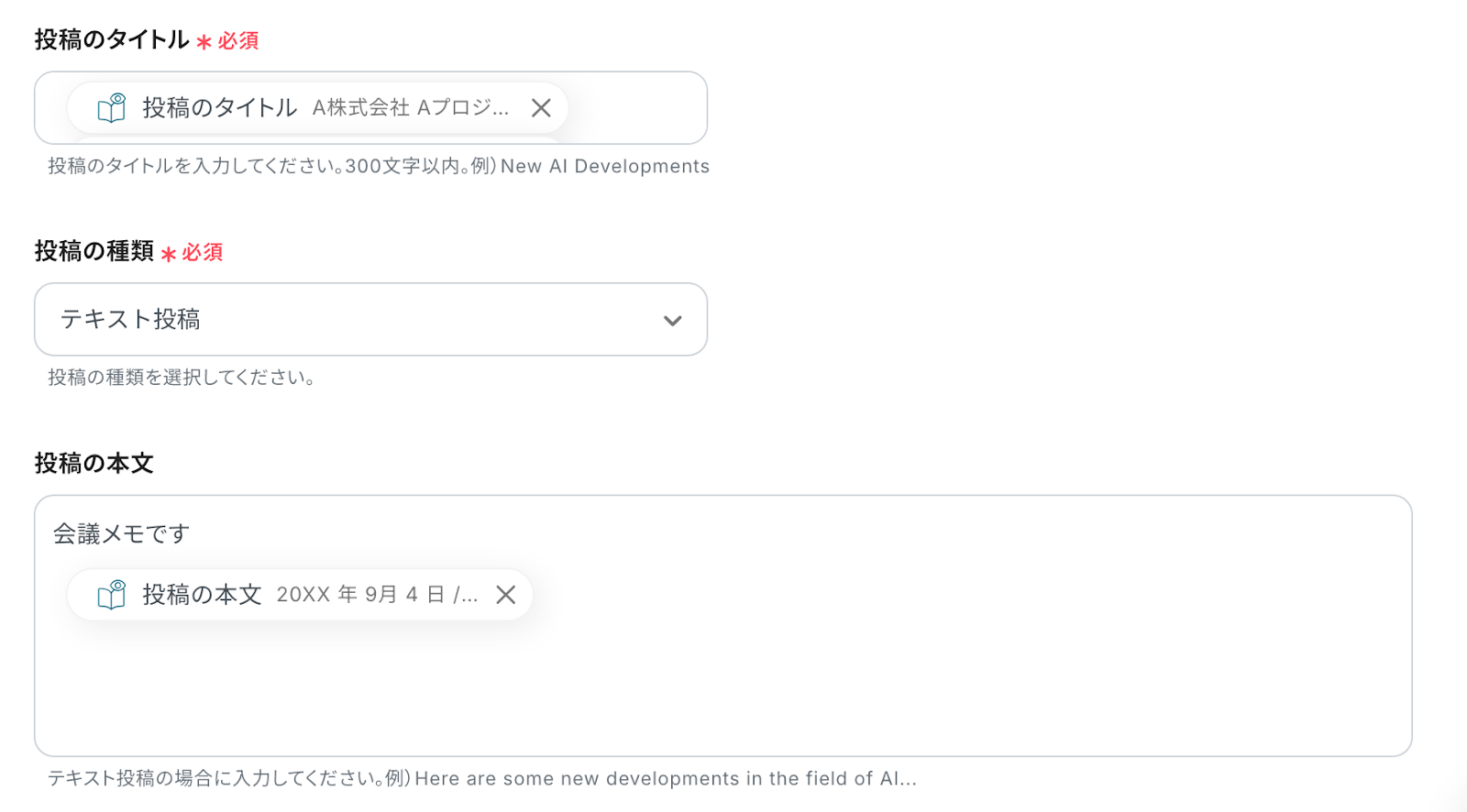 「投稿の本文」は、任意で作成した文章と前ステップで取得した情報を組み合わせて入力しましょう。
