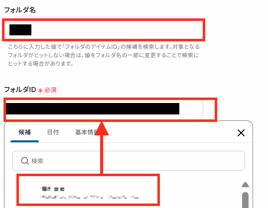 ファイルのアイテムIDは取得した値より「アイテムID」を選択し入力してください。