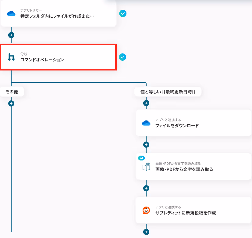 もしほかのサブレディットにも投稿したい場合は、フローボットの最下部の「+」マークからRedditのオペレーションを別途追加します。