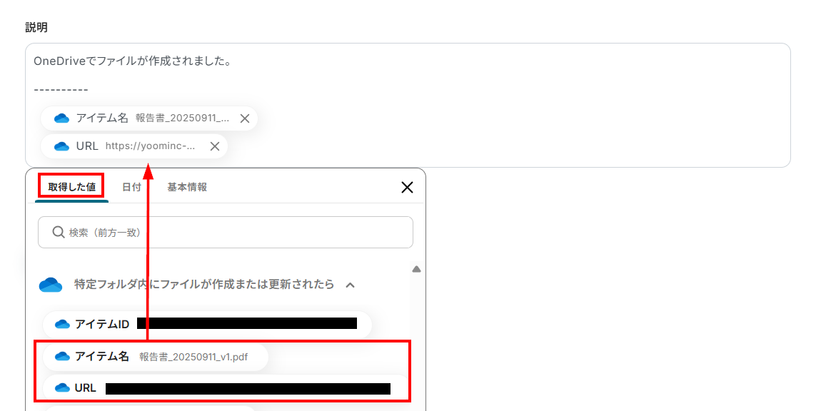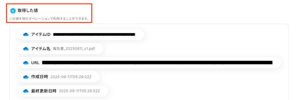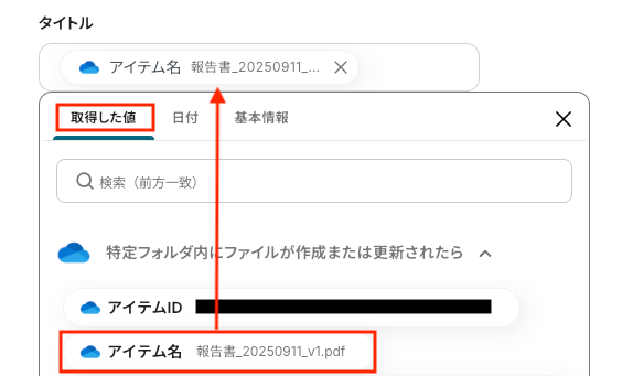 以下のように取得した値を利用することで、フローボットが起動するたびにOneDriveにアップロードしたファイル情報を取得し、タイトルに反映されます。