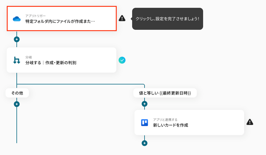 一つ目のオペレーションにある、「特定フォルダ内にファイルが作成または更新されたら」をクリックしてください。