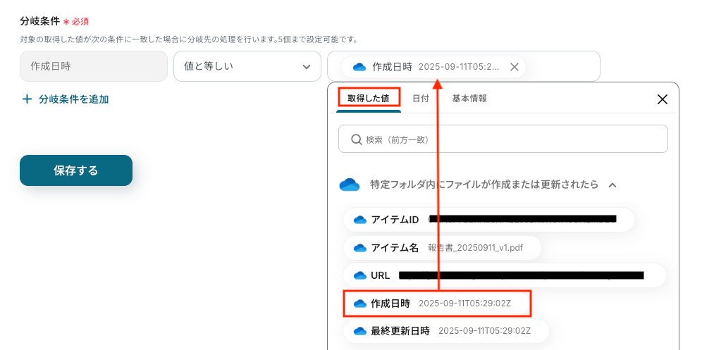 「分岐条件」は、指定したい要件を入力します(ここでは「作成日時」を指定)。