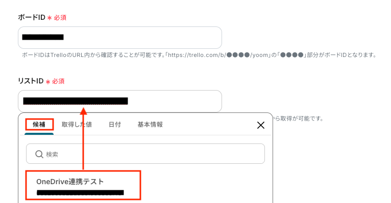 「ボードID」を手動で入力し、「リストID」は候補から選択します。