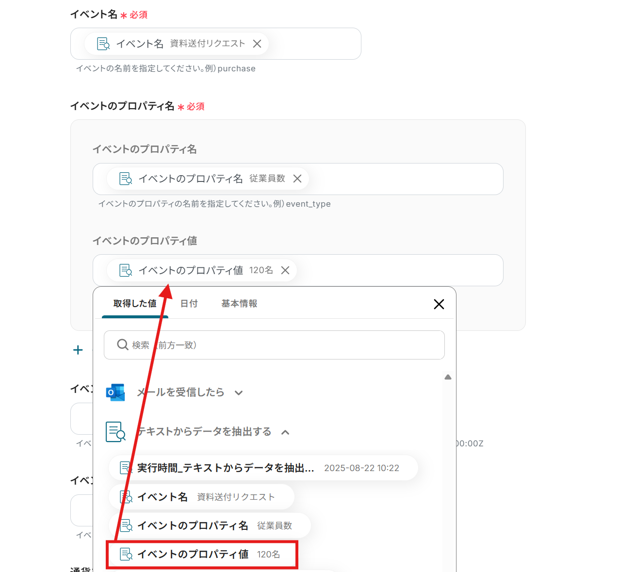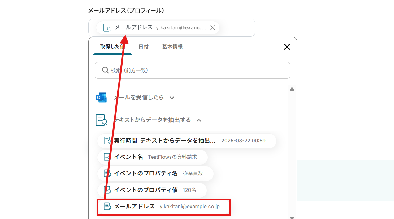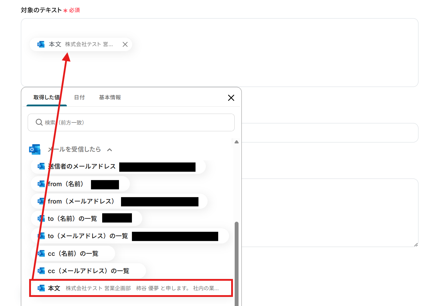 - 対象のテキスト:抽出対象のテキストを指定しましょう。編集欄をクリックするとメールから取得した情報を引用できます。今回は以下のようにメールの本文をそのまま引用しています。取得した値を活用することで、手入力による転記ミスも防げます。