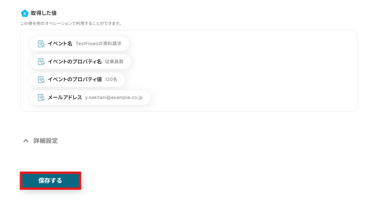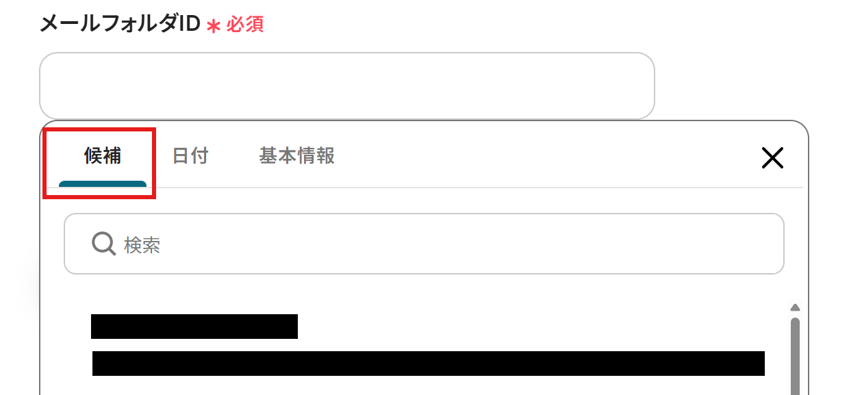 - メールフォルダID:入力欄をクリックすると候補が表示されるので、その中から選択しましょう。もし候補がうまく表示されない場合は、マイアプリ連携の設定をもう一回チェックしてみてください。