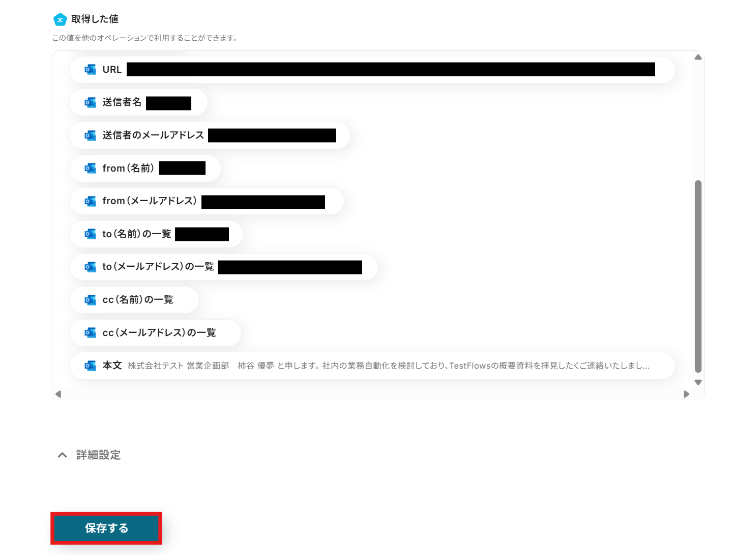 テストが成功すると、「テスト成功」という画面が表示され、Outlookから取得した情報をYoomで引用できるようになります。