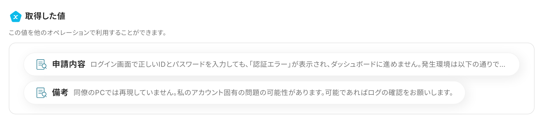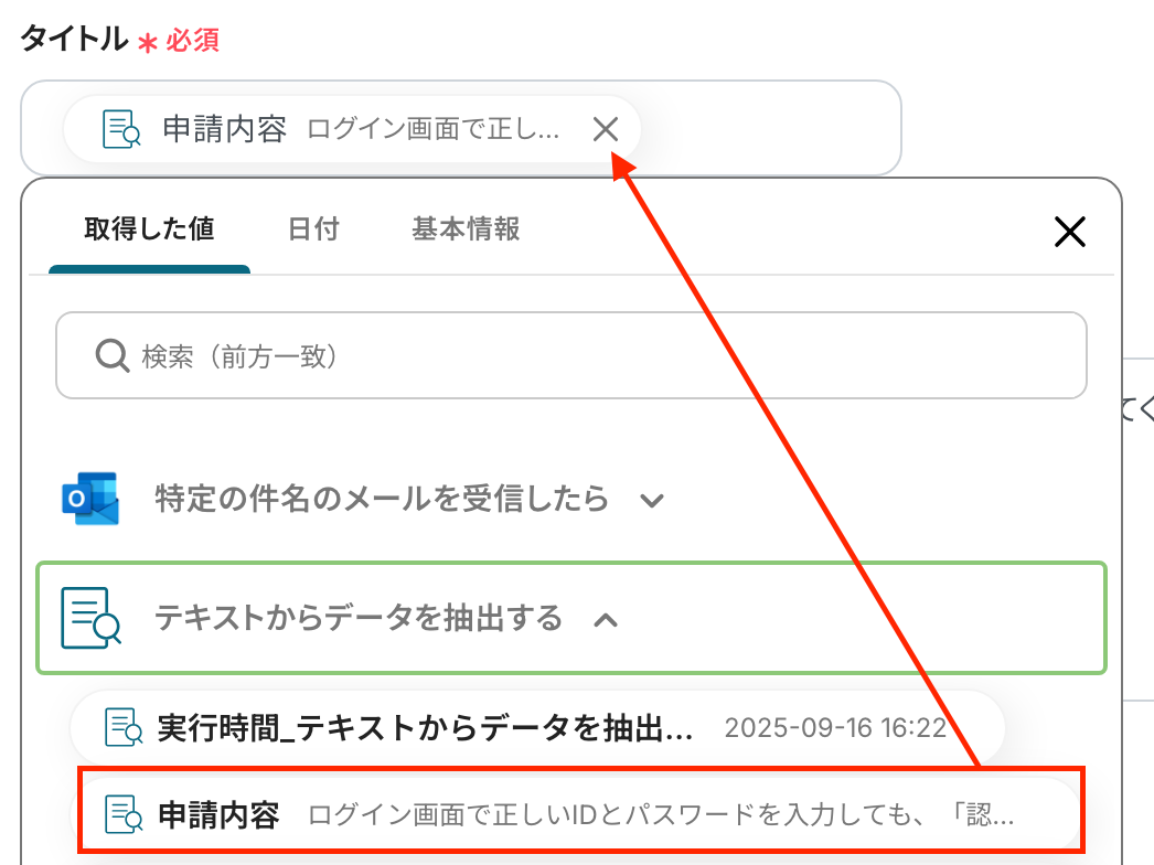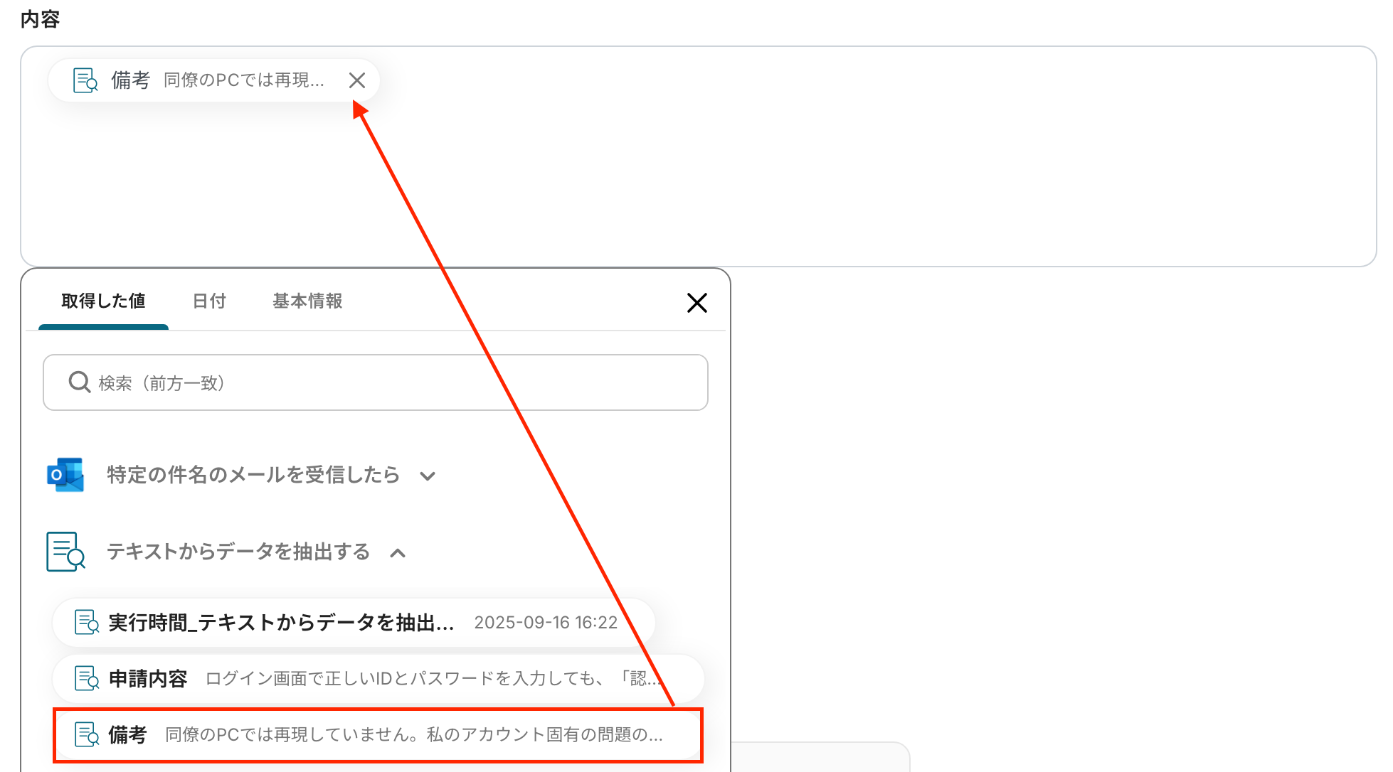 入力欄をクリックして表示される『取得した値』を引用して設定してください。