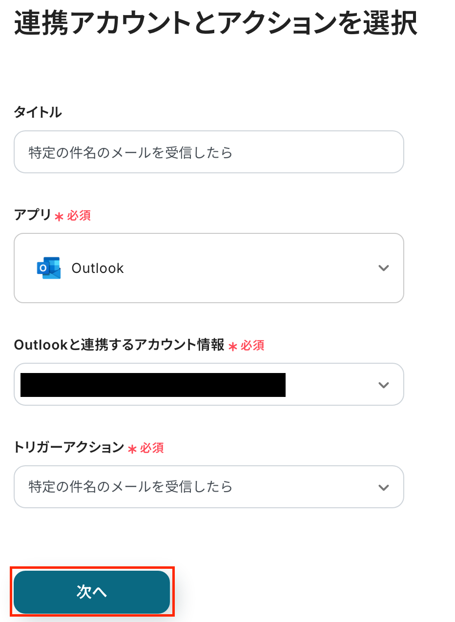 - 「トリガーアクション」:「特定の件名のメールを受信したら」を選択