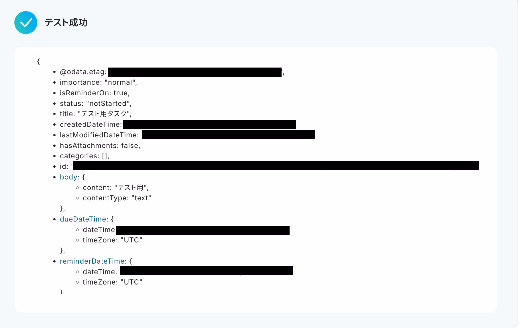 「テスト成功」と表示が出たら、アウトプット(取得した値)が取得されます。