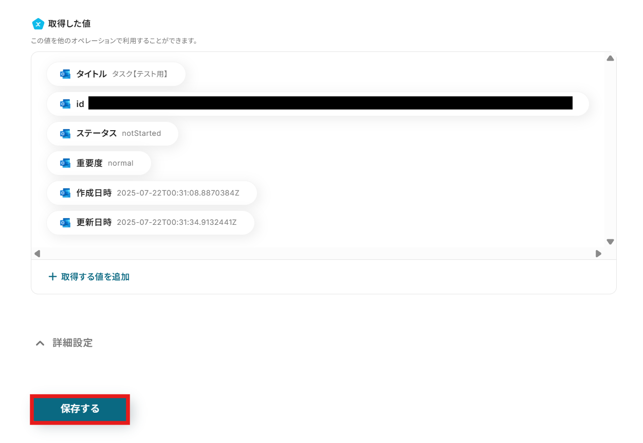 テストが正常に完了すると、「テスト成功」という画面が表示され、Outlookから取得した情報を引用できるようになります。