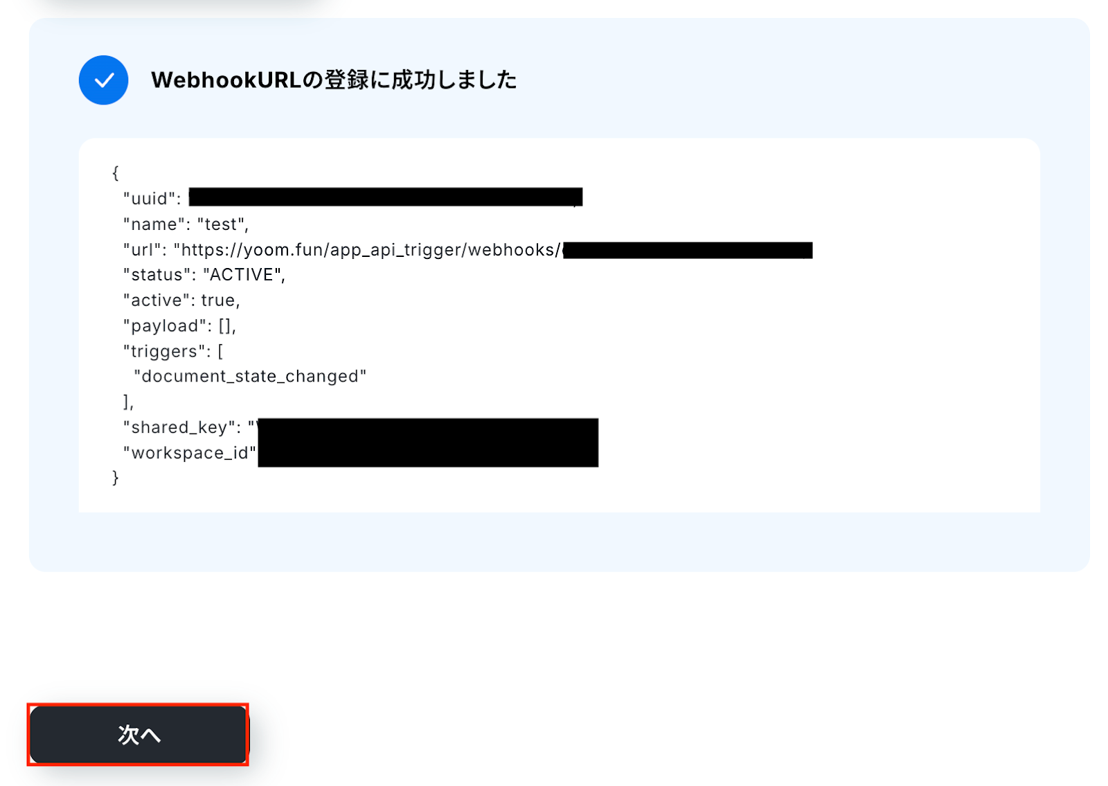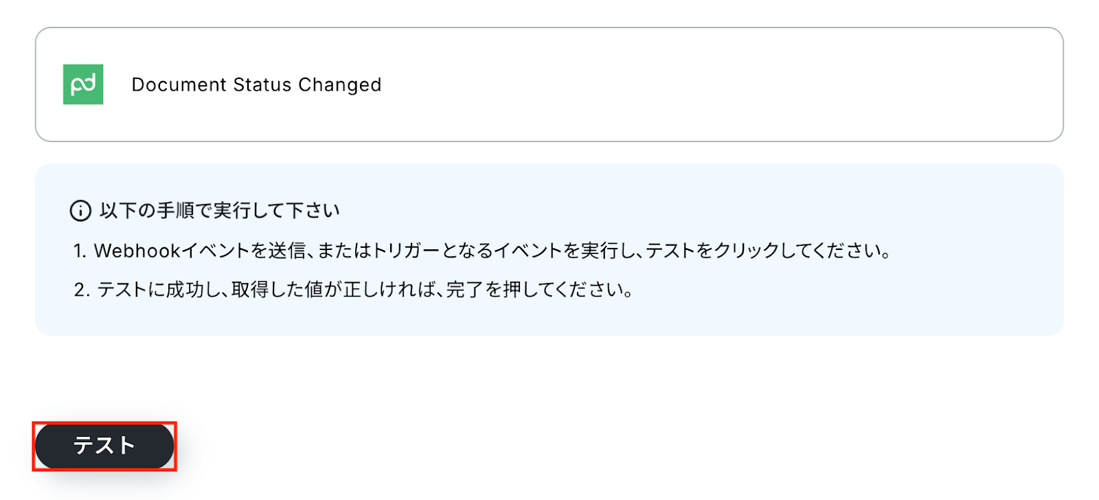 「WebhookURLを登録」をクリックして、YoomがPandaDocからWebhookを正しく受け取れるか確認しましょう。