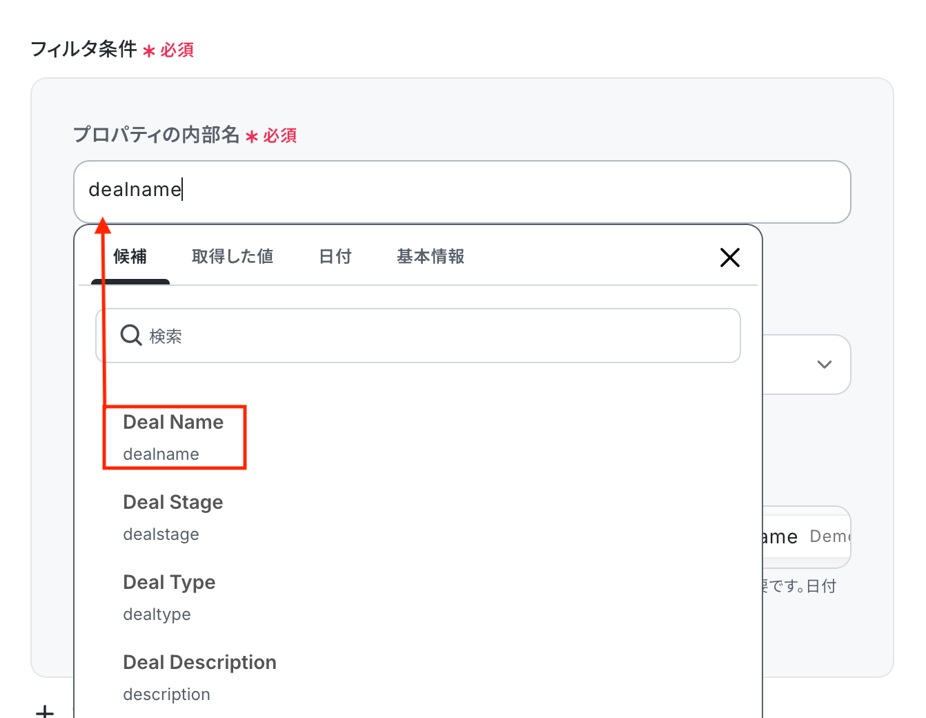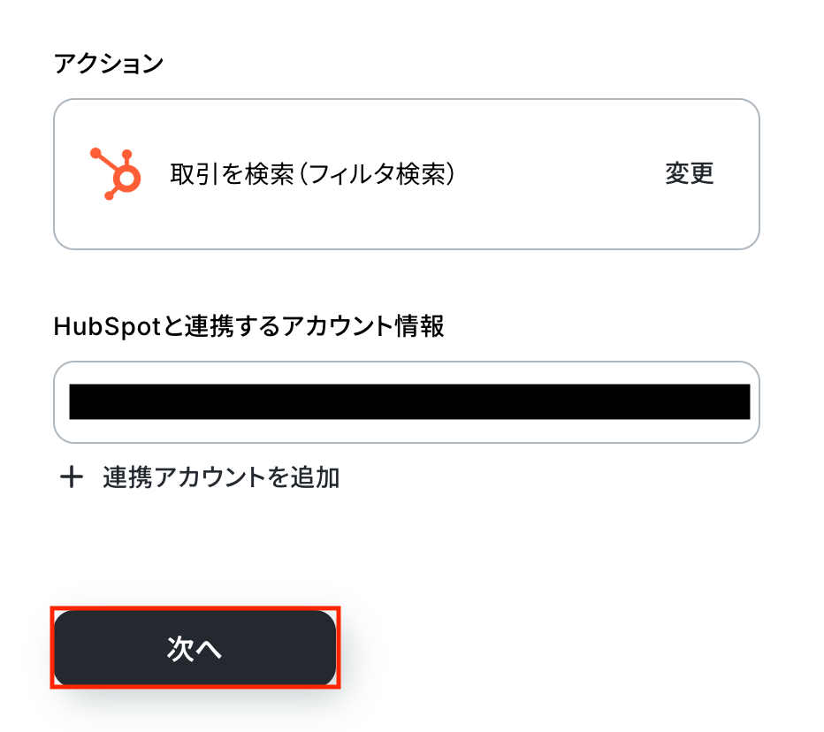 続いて、前のステップで取得した値を利用して、HubSpotで更新先となる取引を検索しましょう。