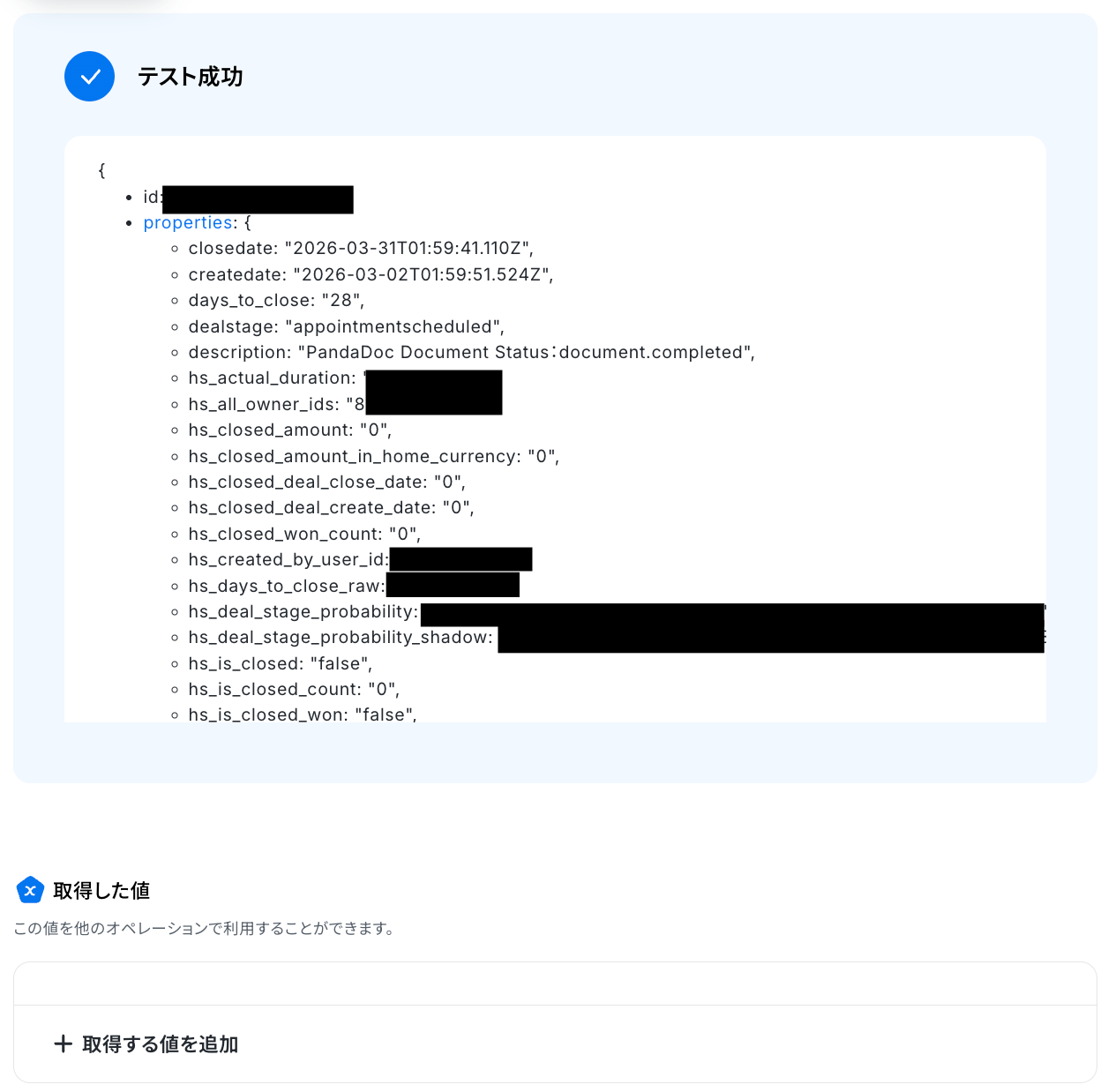 テストに成功すると、HubSpotで検索された取引情報が表示されます。