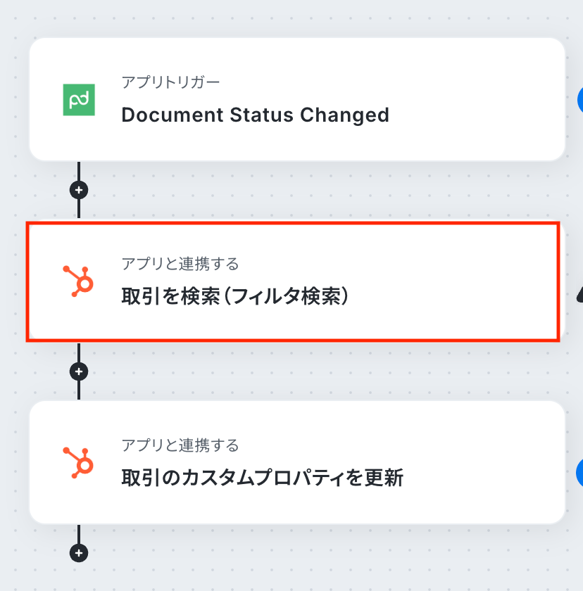 - 次に、オペレーションでHubSpotを選択し、「取引を検索(フィルタ検索)」アクションでステータスが変更されたドキュメントに関連する取引を特定します。