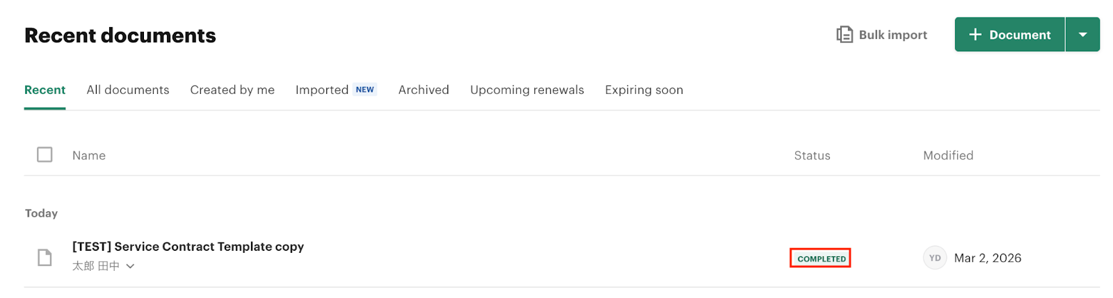 テスト用に、PandaDocでDocumentのステータスを変更しておきましょう。