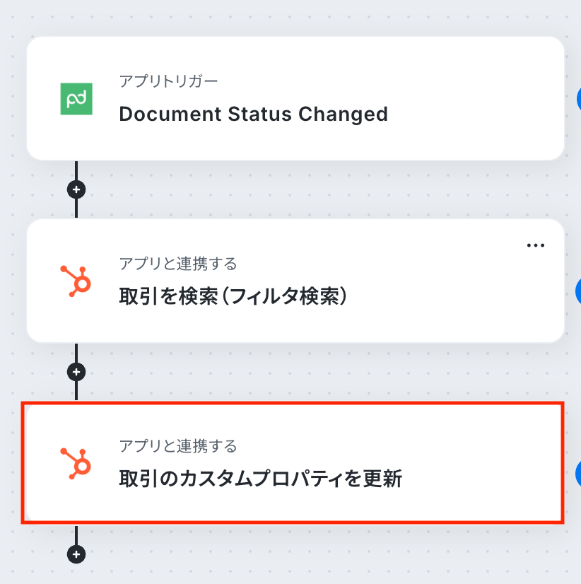 - HubSpotの「取引のカスタムプロパティを更新」アクションでは、更新対象の取引プロパティと、PandaDocから取得したステータスなどの値を任意で設定してください。