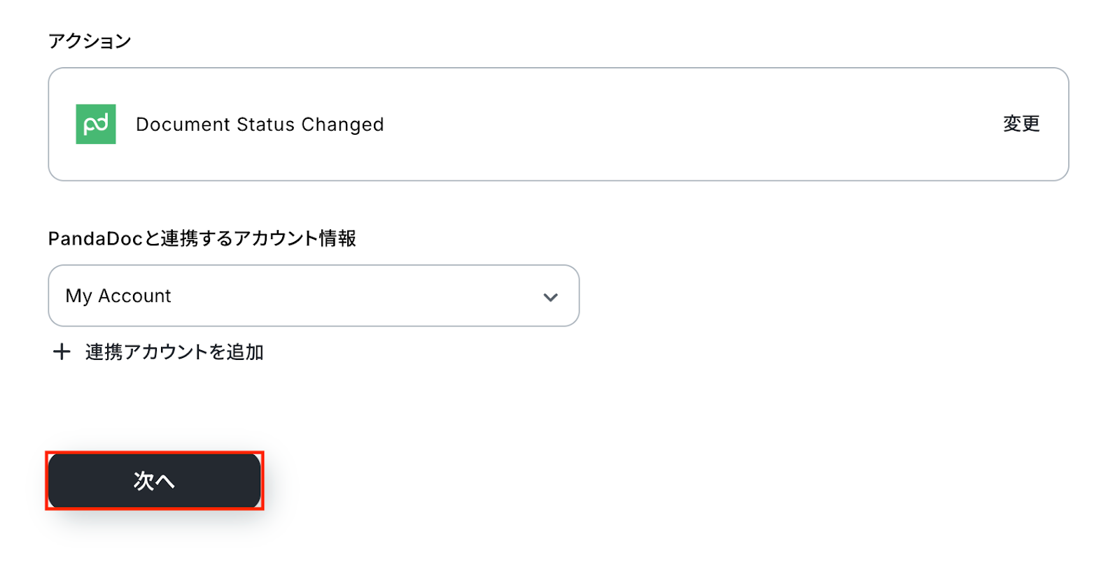PandaDocと連携するアカウント情報に問題がなければ、「次へ」をクリックします。