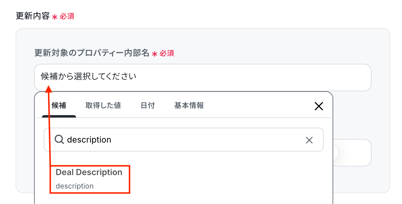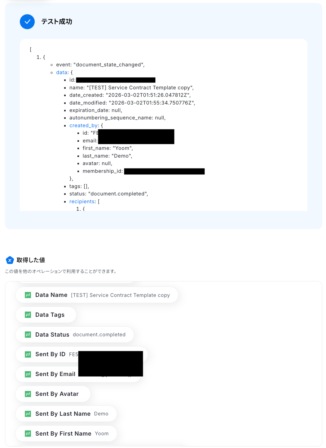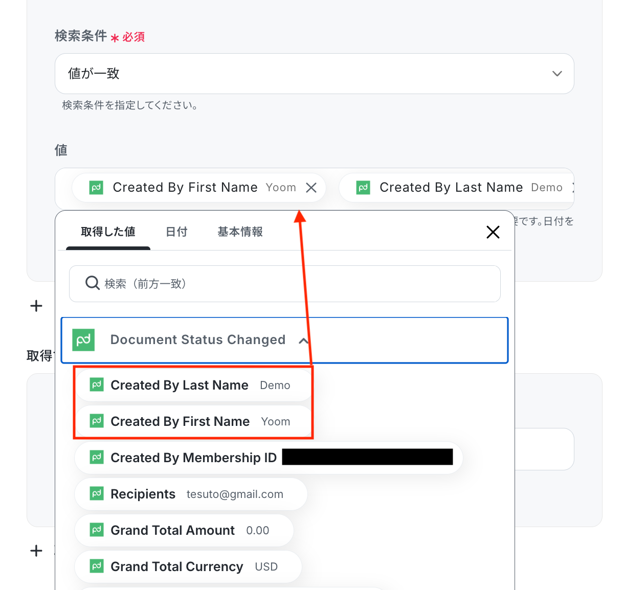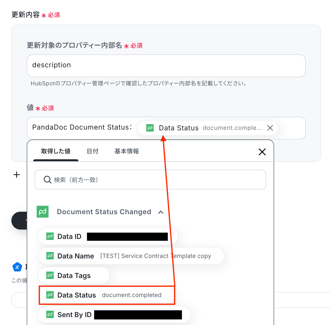 入力欄をクリックすると、前のステップでPandaDocから取得した値が表示されるので、選択して入力しましょう。