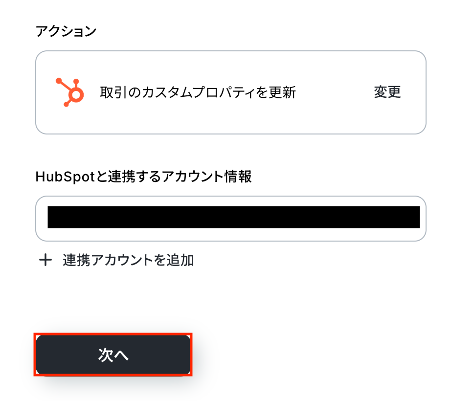 - 最後に、オペレーションで再びHubSpotを選択し、「取引のカスタムプロパティを更新」アクションで、特定の取引情報を自動で更新するよう設定します。