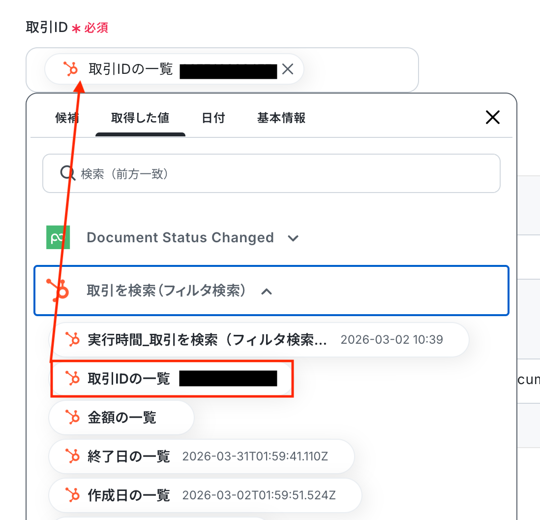 - HubSpotの「取引を検索」アクションでは、PandaDocから取得したドキュメント情報(ドキュメントIDや関連する取引IDなど)を基に、検索条件を任意で設定してください。