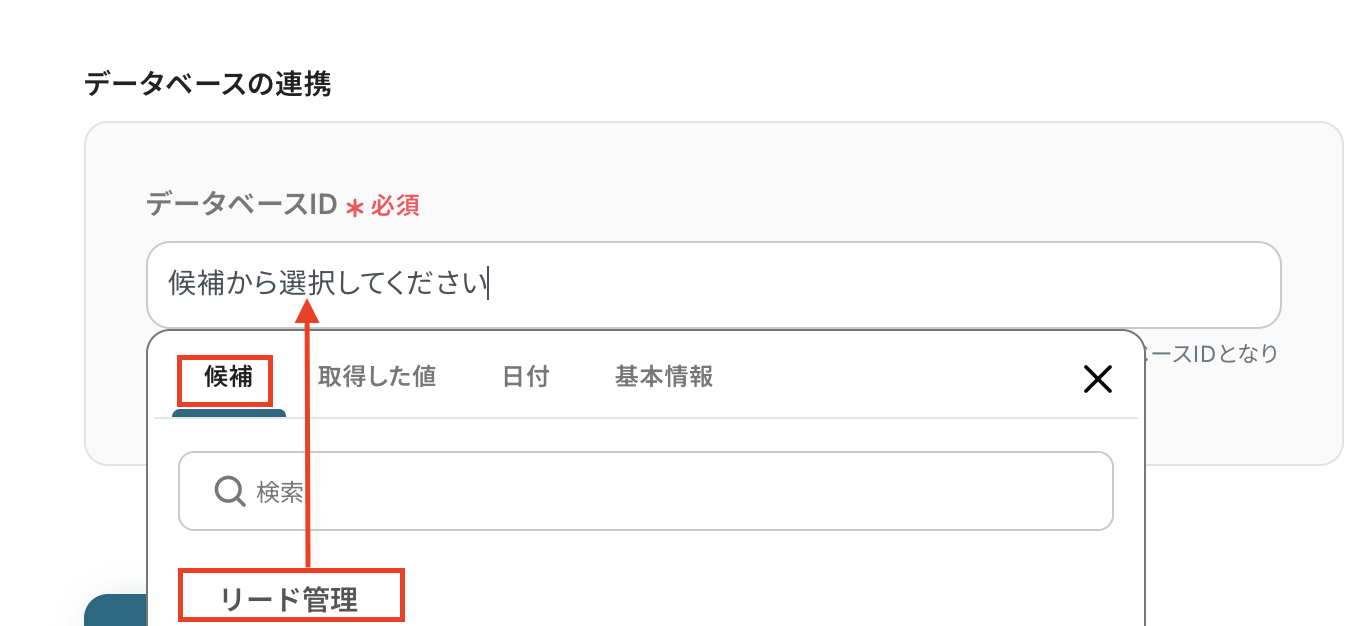 データベースIDは候補から選択するか注釈を確認し、設定してください。