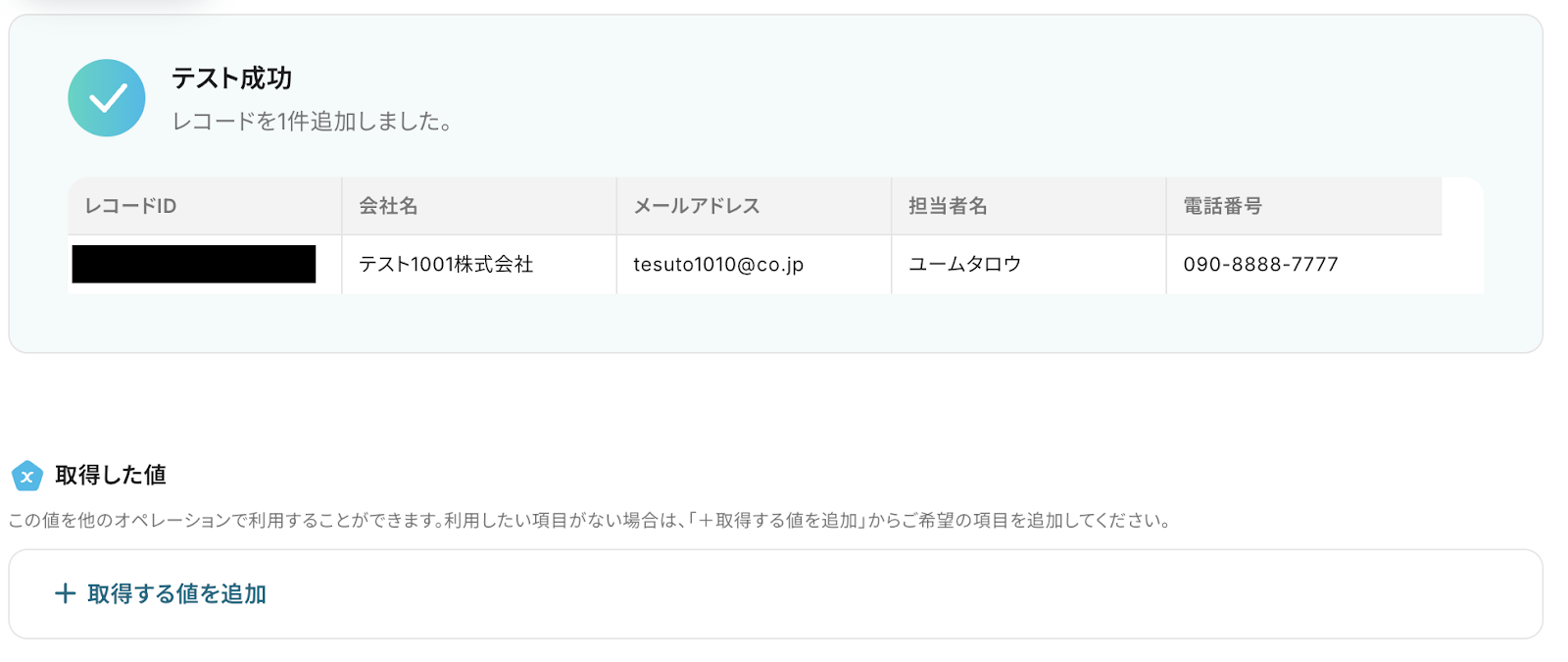 A:ここではHubSpotのコンタクト情報を追加するフローだったので、「会社名」「担当者名」「メールアドレス」「電話番号」が追加できるデータベースを用意しました。