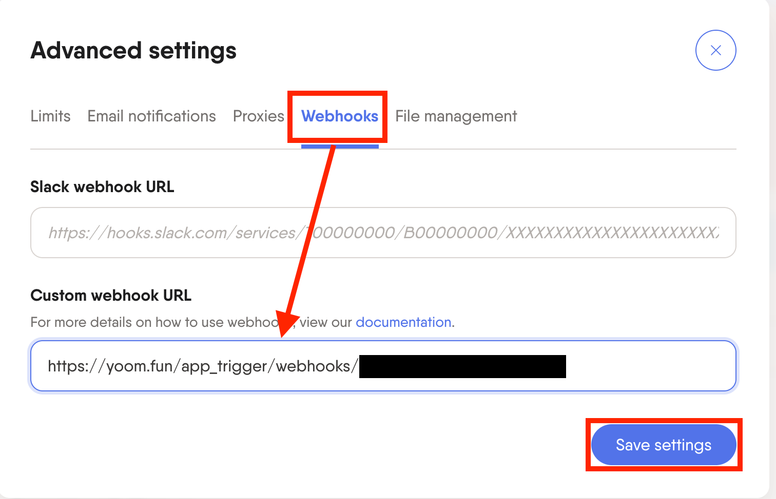「Custom webhook URL」に先ほどコピーしたURLを貼り付け、「Save settings」を押しましょう!