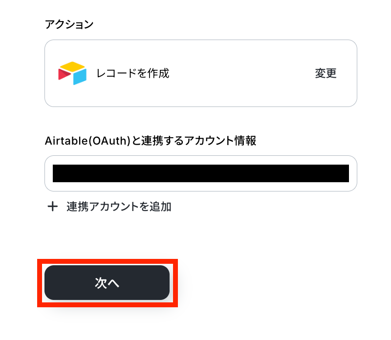 取得した値を用いて、Airtableでレコードを作成する設定を行います。次の赤枠をクリックしましょう。