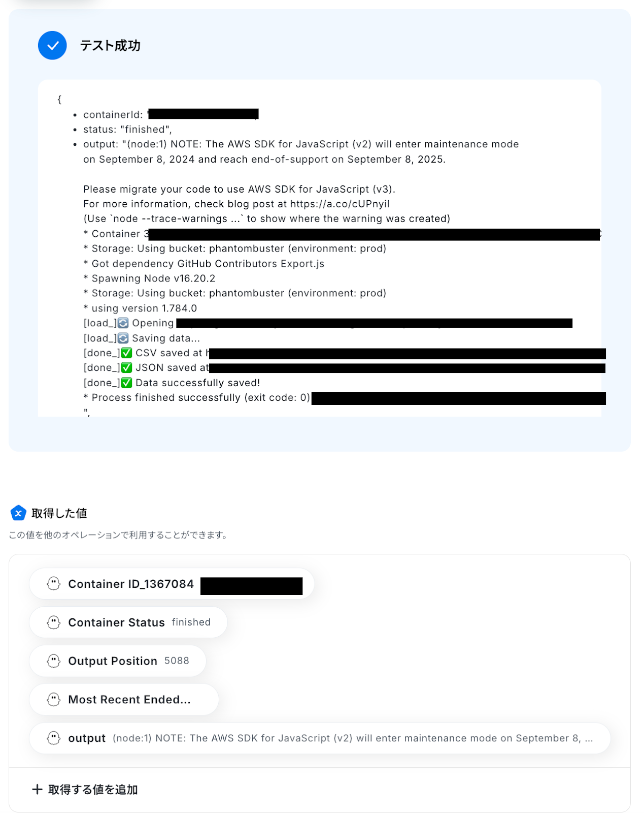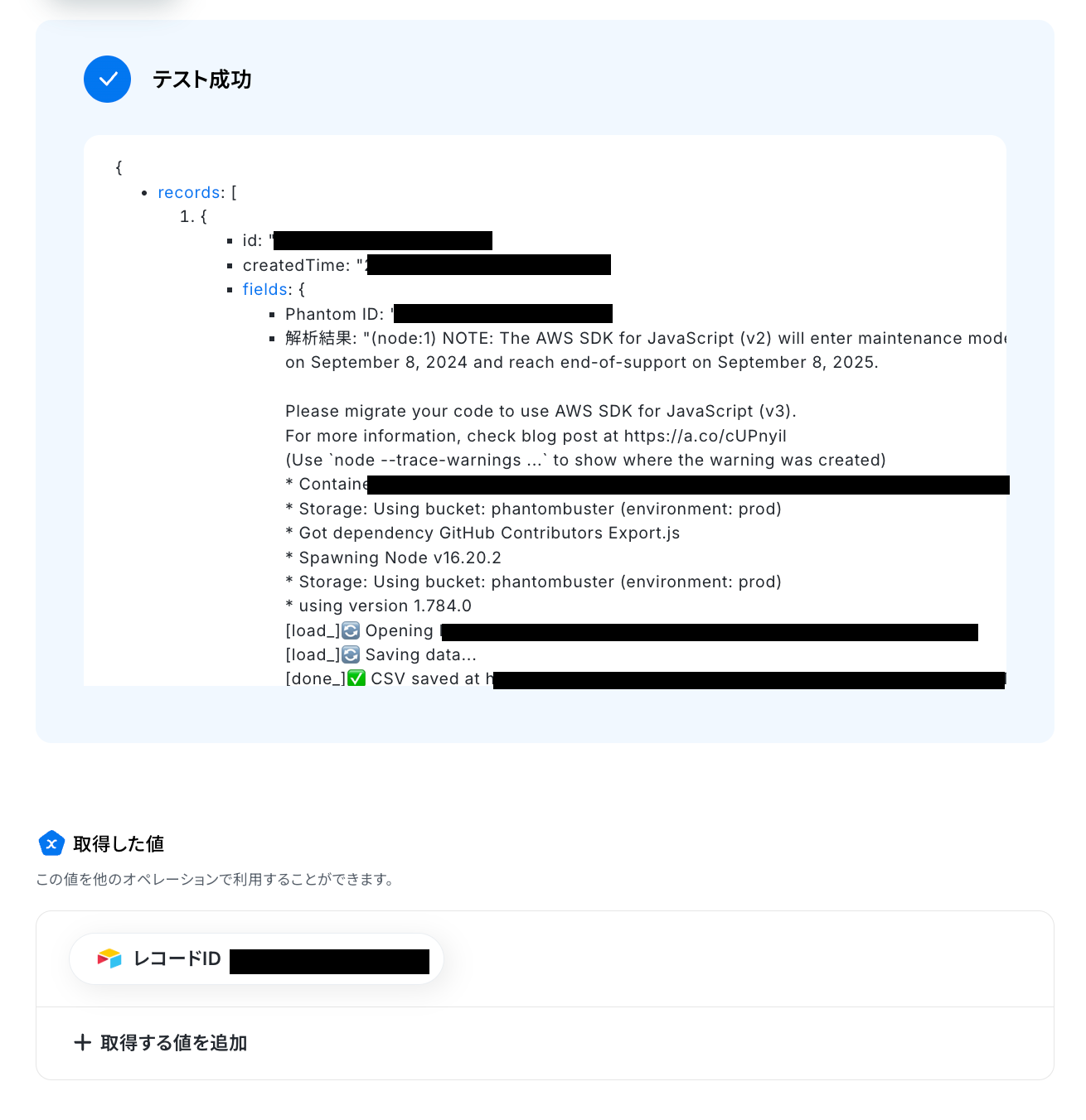 テストが成功して取得した値が確認できたら、「完了」ボタンを押しておきます。