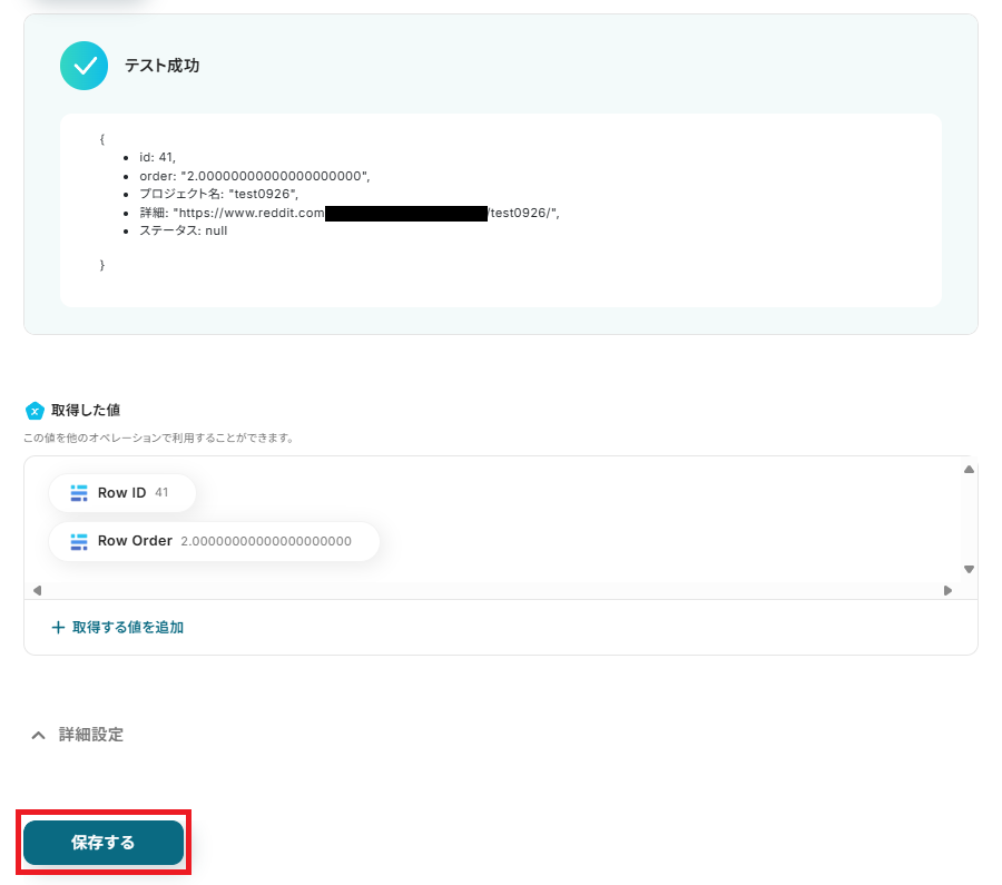 下へスクロールすると、Redditの情報が「取得した値」として反映されていることが分かります。