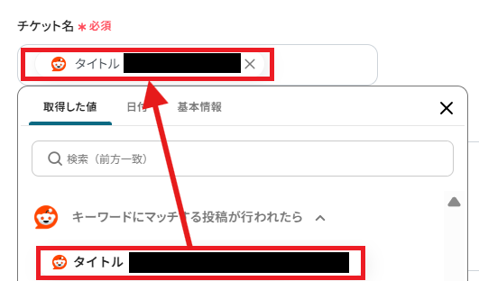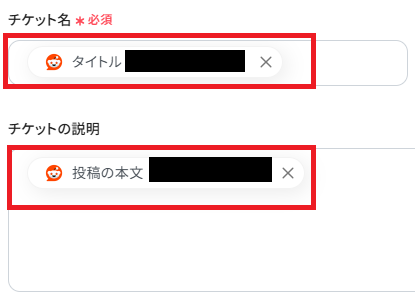 チケット作成に必要な情報を入れていきます。チケット名は「タイトル」を、チケットの説明は「投稿の本文」を、取得した値よりそれぞれ入れていきます。