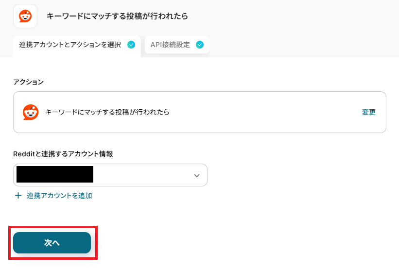 アカウント情報は、トリガーと連携したいアカウントが選択されているか確認し、「次へ」を押して進みましょう。