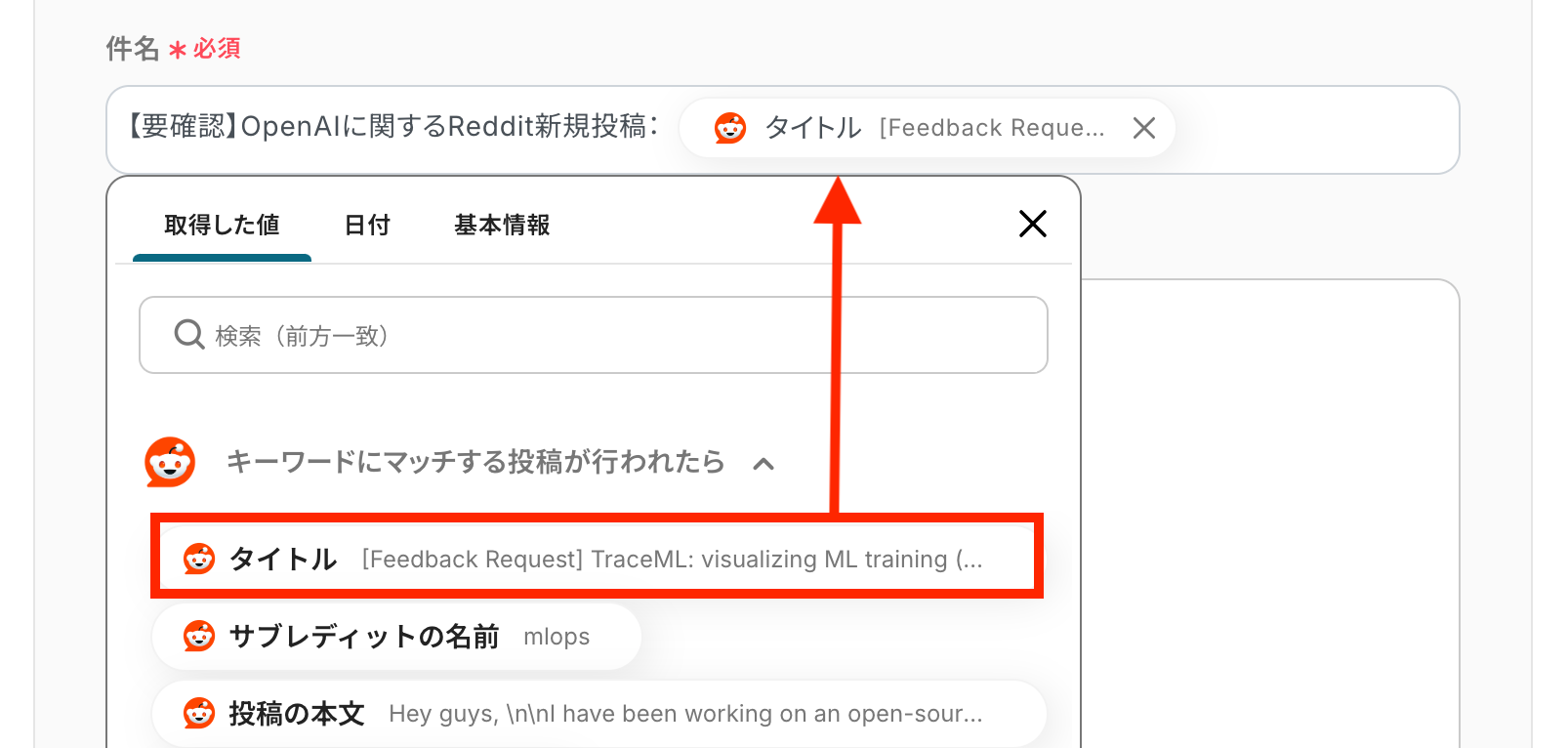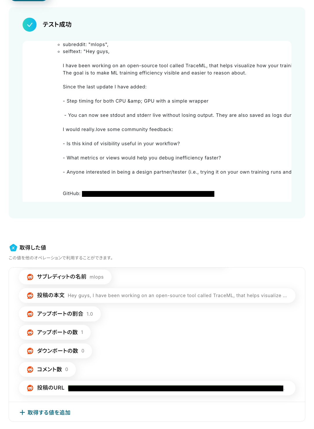 アプリトリガーで取得した値から、Redditのアウトプットを入れてください。