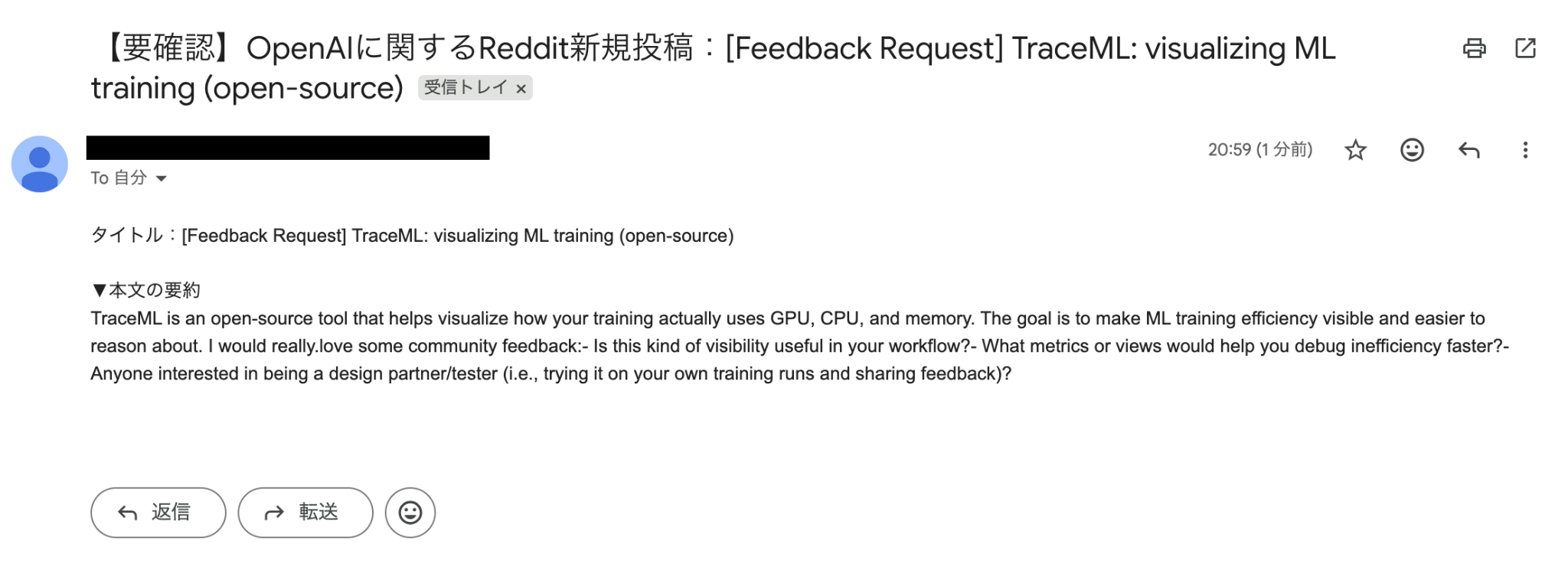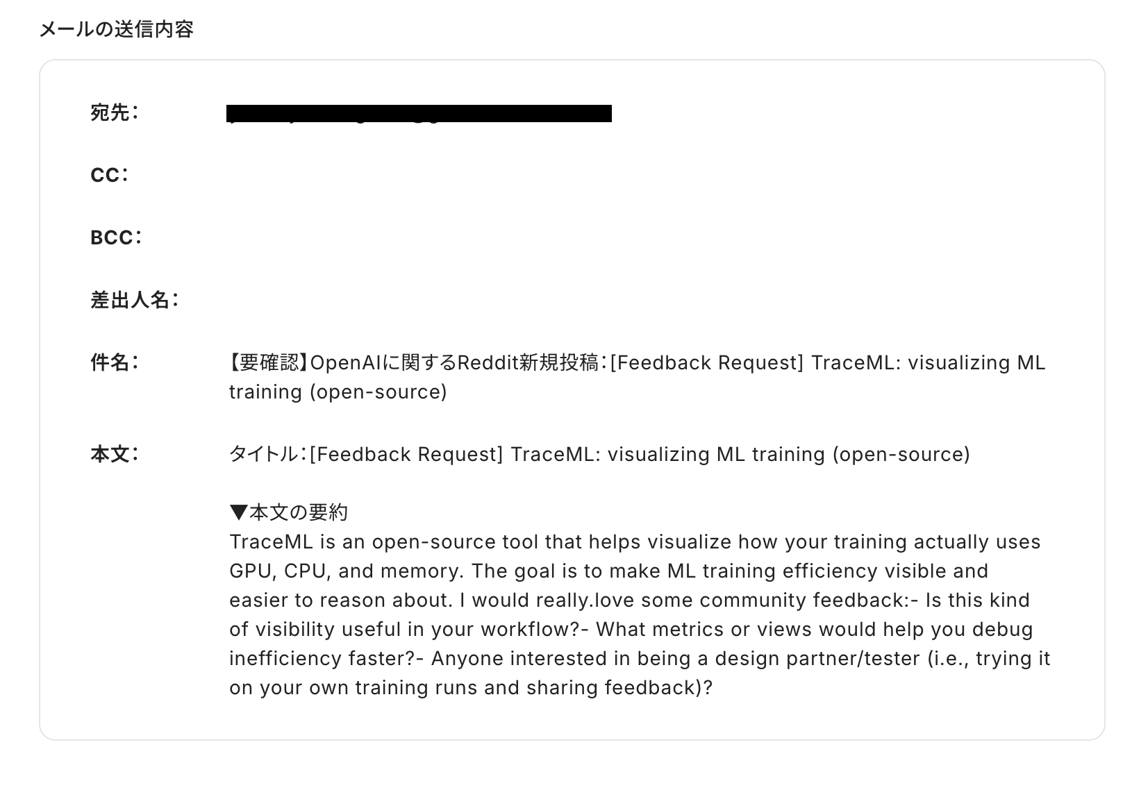 Redditの特定のサブレディットで、自社製品名や関心のあるキーワードを含む投稿がされた際に、その投稿内容をHugging Faceの要約モデルで自動的に要約し、結果をメールで通知する連携です。
