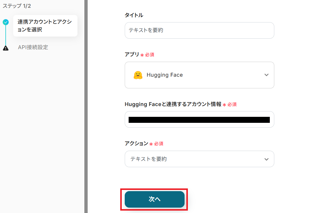 タイトルを任意で設定し、Hugging Faceと連携するアカウントやアクション内容を確認したら「次へ」を押してください。